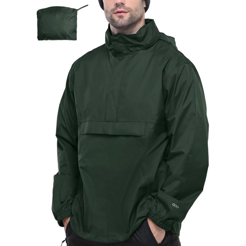 33,000ft Men’s Pullover Rain Jacket Waterproof with Hood Lightweight Packable Raincoat Windbreaker for Golf Travel(Dark Green)